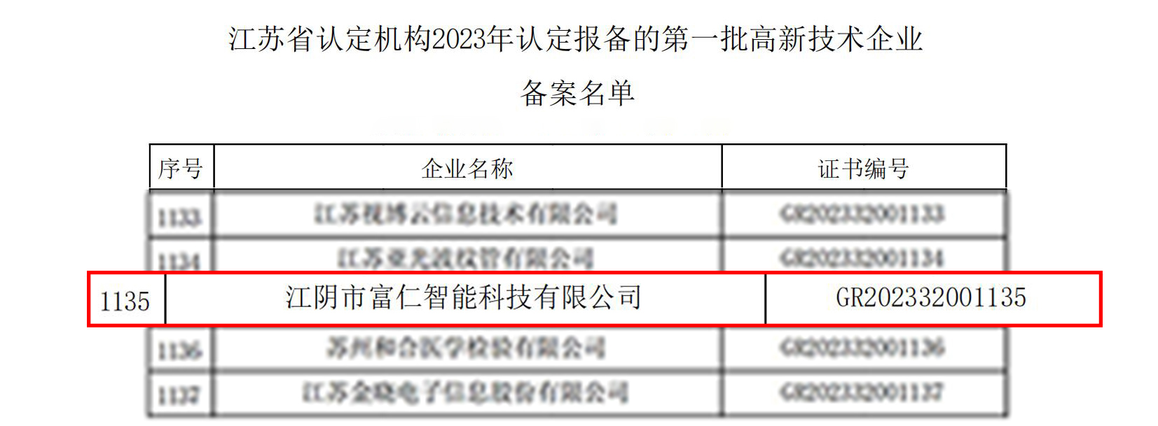 日前,全國高新技術(shù)企業(yè)認(rèn)定管理工作領(lǐng)導(dǎo)小組辦公室發(fā)布《對(duì)江蘇省認(rèn)定機(jī)構(gòu)2023年認(rèn)定報(bào)備的第一批高新技術(shù)企業(yè)進(jìn)行備案的公告》名單,江陰市富仁智能科技有限公司位列其中,正式被認(rèn)定為國家高新技術(shù)企業(yè)。