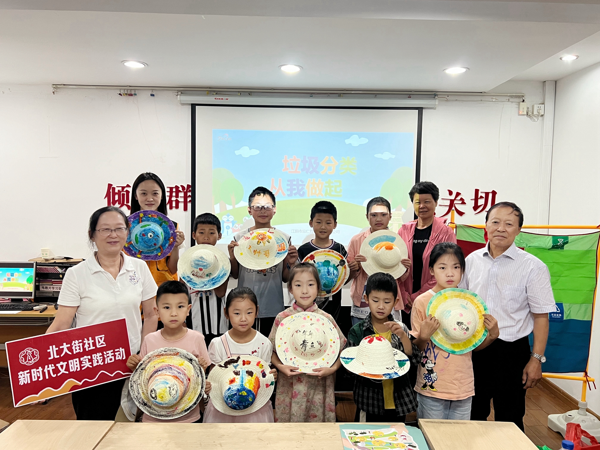 最后,宣講員和小朋友們一同制作了環(huán)保草帽。一雙雙巧手在草帽上繪制著各種美好,有青山綠色,有鮮花盛開(kāi),有落日余暉……制作完成后,小朋友還將產(chǎn)生的垃圾分類投放,真正做到了活學(xué)活用。