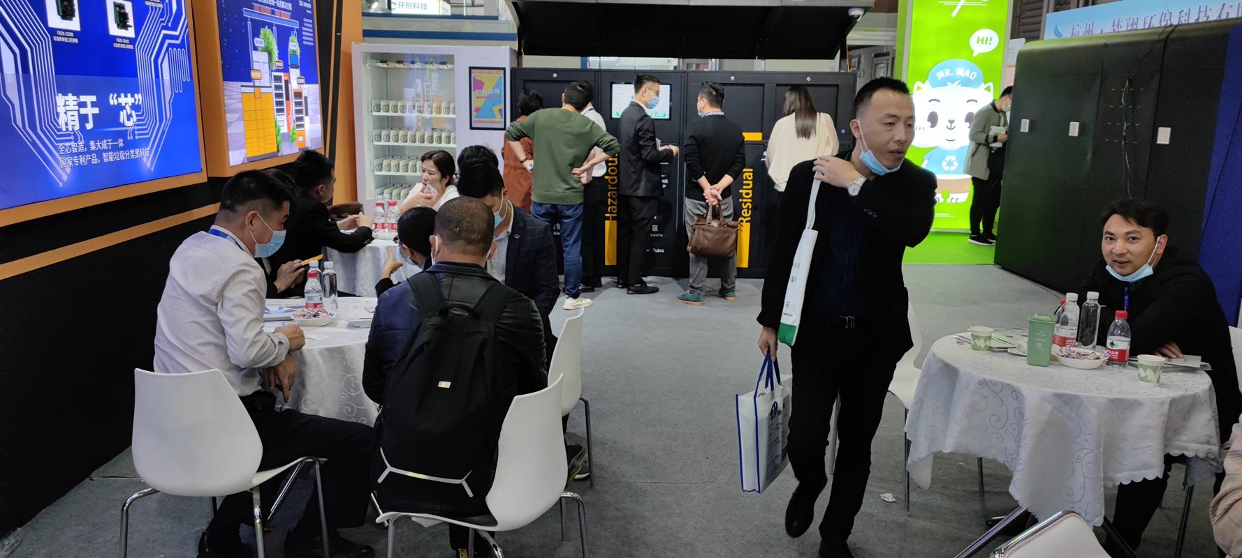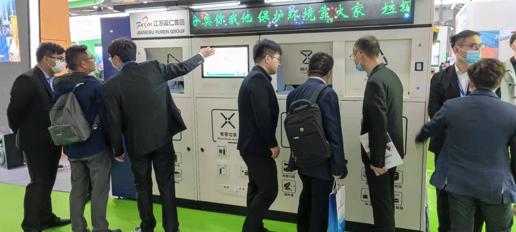 富仁智能首次參與這場全球一流的環保展會,展示公司環保裝備制造、行業解決方案等領域取得的最新成果和前沿技術。全新上市的兩款智能分類垃圾柜亮相次展會,科技簡約的外觀,搭載自主研發的軟硬件技術,吸引無數參展者駐足觀看。